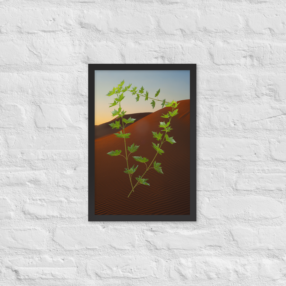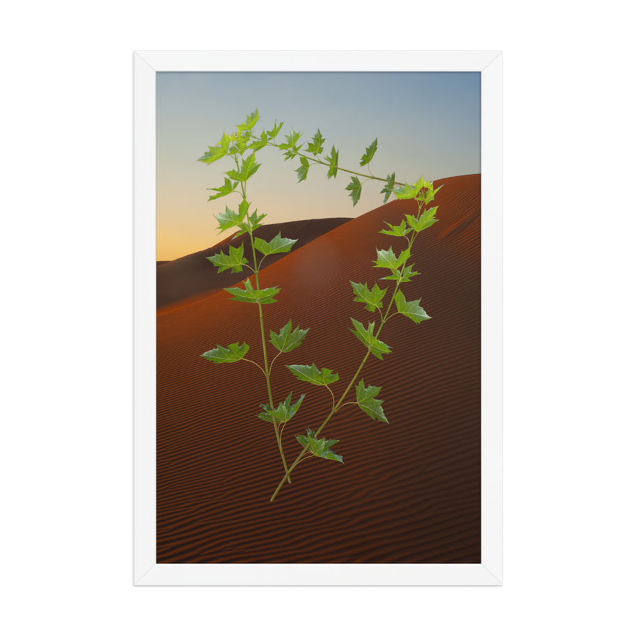 This piece invites the viewer into a moment of surreal tranquility within the vast, undulating desert dunes of Dubai. This photographic abstract captures three delicate branches, seemingly defying gravity, as they float in the sun-drenched air against the majestic backdrop of the golden desert. The stark simplicity of the branches, detached yet serene, speaks to themes of resilience, displacement, and the unexpected beauty found in limonal spaces the gentle touch of sunlight illuminates both the ethereal branches and the soft curves of the dunes, creating a dialogue between the temporary and the eternal. Its is the contemplation on presence and absence, a visual whisper asking us to consider what hold us, what grounds us, and what allows us to float, even for a moment in the expanse of existence.
